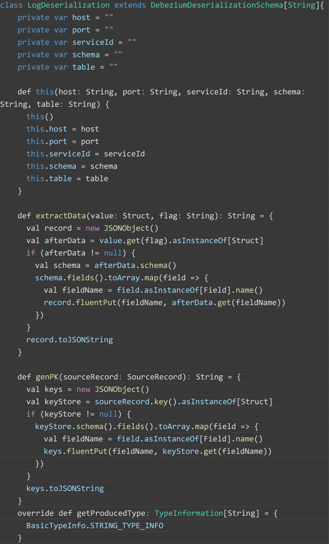 由于 Flink CDC 内部集成了 Debezium 组件,通过 Debezium 进行数据采集,所以数据格式同 Debezium,监听到的数据格式如下图所示,after 代表变化后的数据;source 代表源端的数据库相关信息,包括 Debezium 版本号、连接器类型、数据库名、表名等;op 代表操作的类型,此处为读操作。