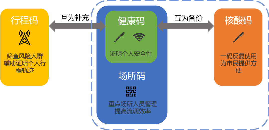 具体来说,健康码是最早推出的,也是场所码与核酸码的基础。其中,场所码包含健康码信息,并附加扫码动作发生时市民所处的场所与时间信息;而核酸码与健康码互为备份,对核酸异常情况精准溯源。行程码则独立于健康码、核酸码和场所码,它们之间的关联如下图所示。