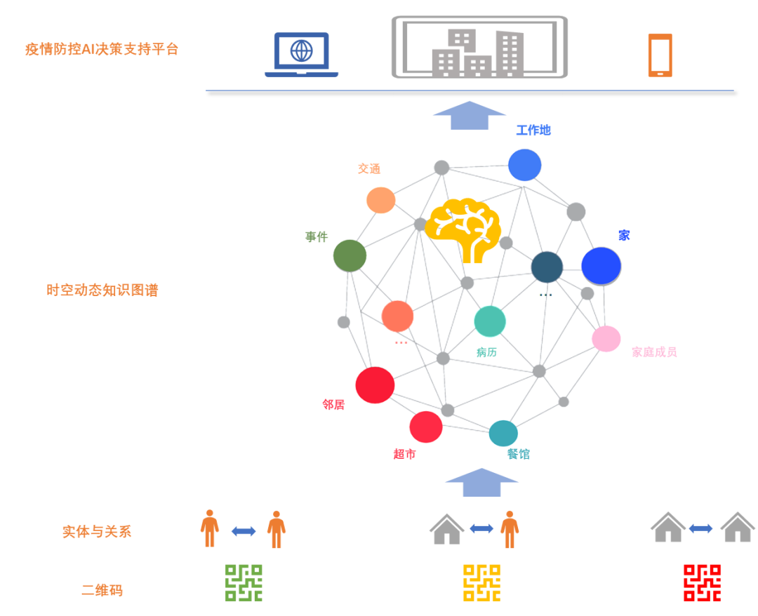 以上这些二维码承载着个人基础信息、个人健康信息、位置信息、行程信息、核酸检测等疫情相关数据,具有时间和空间双重属性,在此基础之上,将二维码背后所代表的人与人、人与场所、场所与场所之间进行时空关联,打破数据孤岛,构建疫情动态时空知识图谱,并在时空知识图谱上利用深度学习和AI算法进行图分析计算,实现回溯患者历史轨迹、寻找紧密接触人群、高危区域风险预警等多角度的防控决策支持和分析服务,辅助常态化精准防控和“动态清零”工作的开展。具备这些功能的“疫情防控AI决策平台”正是智慧城市在疫情防控场景下发挥的巨大价值的体现。