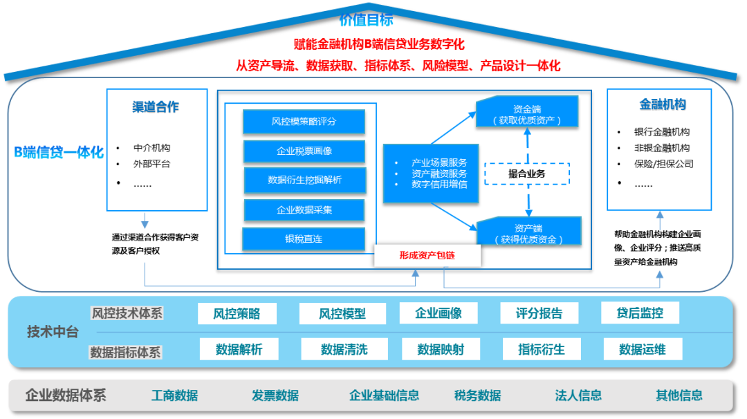最底层是企业的数据体系,包括税务和发票数据,以及工商法诉等能够反映企业风险情况的数据。第二层是技术中台,利用数据指标体系完成整体的数据治理和指标衍生,形成上层应用可以直接使用的数据。风控技术体系通过数据已经衍生出的指标,进行企业画像分析、评分报告、贷后监控等全流程的风险监控。之上是渠道合作模式,资产渠道方为资金方提供资产包链(资产包链来自合作及自营的资产渠道,把这些资产形成一个资产包链给到金融机构),辅助金融机构去做企业风险的把控和决策。一站式信贷SaaS服务平台的价值目标就是赋能金融机构B端信贷业务的数字化。服务内容包括:资产导流、数据获取、指标体系、风险模型,以及产品设计的一体化。